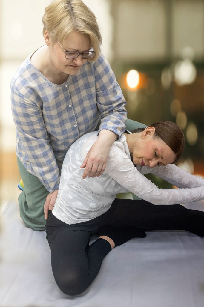 Asiakkaan rauhallisesti venytellessä hoitaja käy kehon energiaratoja läpi ja huomioi hoidollisin ottein kehon kireitä kohtia.